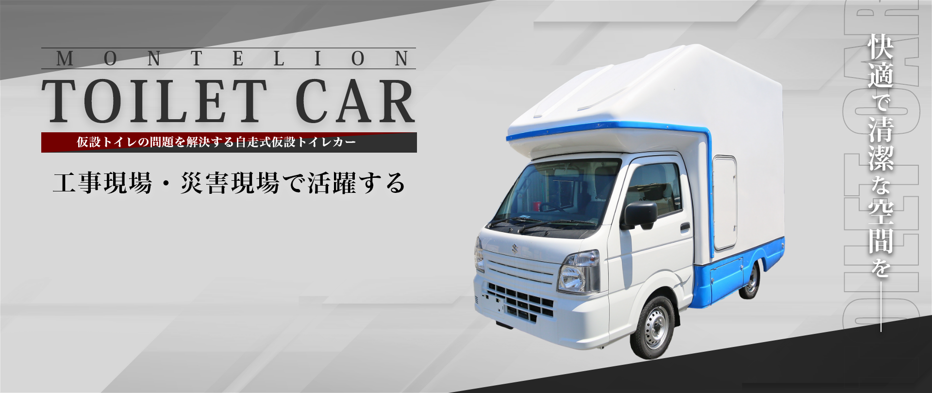モンテリオンは、工事現場や災害現場等で活用できるトイレカーを取り扱う会社です。 誰もがいつでも快適で衛生的な環境でトイレを利用できること。 私たちはトイレカーを通して、どんな時どんな場所でもいつもと同じ快適なトイレ環境の実現に貢献しています。